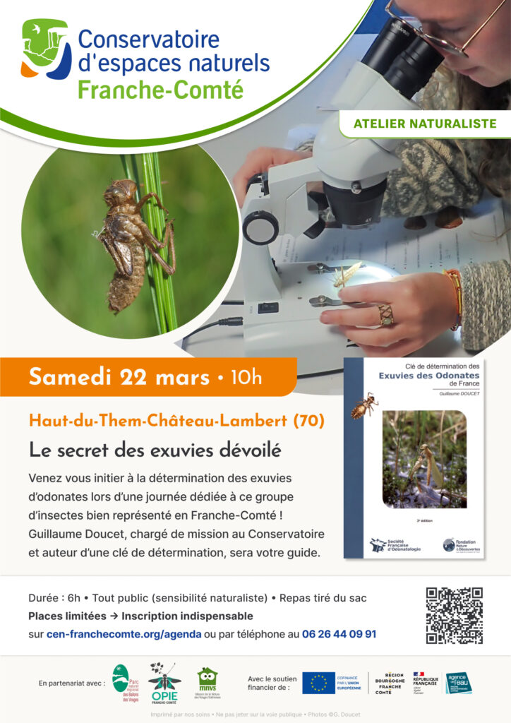 Un second atelier d’identification des exuvies d’odonates vous est proposé par le Conservatoire d’espaces naturels (CEN) de Franche-Comté en partenariat avec le groupe des Demoiselles de l’OPIE Franche-Comté, le Parc naturel régional des Ballons Comtois et la Maison de la nature des Vosges Saônoises.